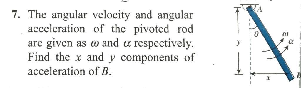 The angular velocity and angular acceleration of the pivoted rod are given as omega and alpha respectively. Find the x and y components of acceleration of B. The angular velocity and angular acceleration of the pivoted rod are given as omega and alpha respectively. Find the x and y components of acceleration of B. September 25, 2020 Category: Uncategorised (JEE Advanced Physics by BM Sharma + GMP Solutions) , Facebook Messenger WhatsApp Share this:TwitterFacebook Related