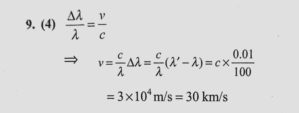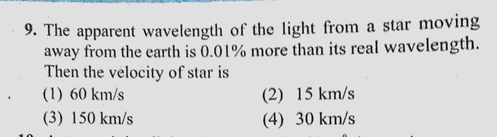 The apparent wavelength of the light from a star moving away from the earth is 0.01% more than its real wavelength. Then the velocity of star is The apparent wavelength of the light from a star moving away from the earth is 0.01% more than its real wavelength. Then the velocity of star is October 11, 2020 Category: Uncategorised (JEE Advanced Physics by BM Sharma + GMP Solutions) , Facebook Messenger WhatsApp Share this:TwitterFacebook Related