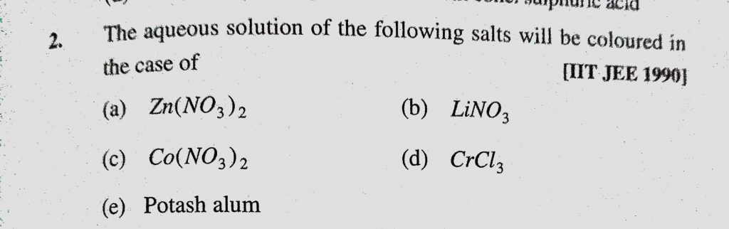 The aqueous solution of the following salts will be coloured in the case of (a) Zn(NO3)2 (b) LiNO3 (c) Co(NO3)2 (d) CrCl3 The aqueous solution of the following salts will be coloured in the case of (a) Zn(NO3)2 (b) LiNO3 (c) Co(NO3)2 (d) CrCl3 December 3, 2020 Category: Uncategorised (JEE Advanced Physics by BM Sharma + GMP Solutions) , Facebook Messenger WhatsApp Share this:TwitterFacebook Related