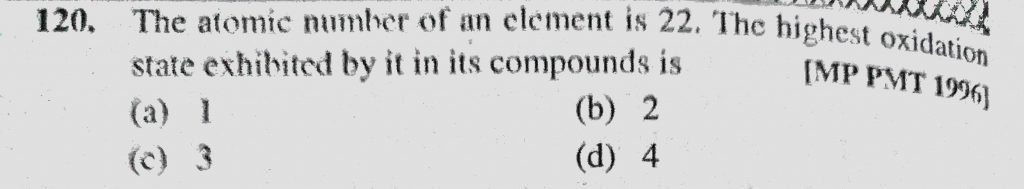 The atomic number of an element is 22. The highest oxidation state exhibited by it in its compounds is (a) 1 (b) 2 (c) 3 (d) 4 The atomic number of an element is 22. The highest oxidation state exhibited by it in its compounds is (a) 1 (b) 2 (c) 3 (d) 4 November 30, 2020 Category: Uncategorised (JEE Advanced Physics by BM Sharma + GMP Solutions) , Facebook Messenger WhatsApp Share this:TwitterFacebook Related