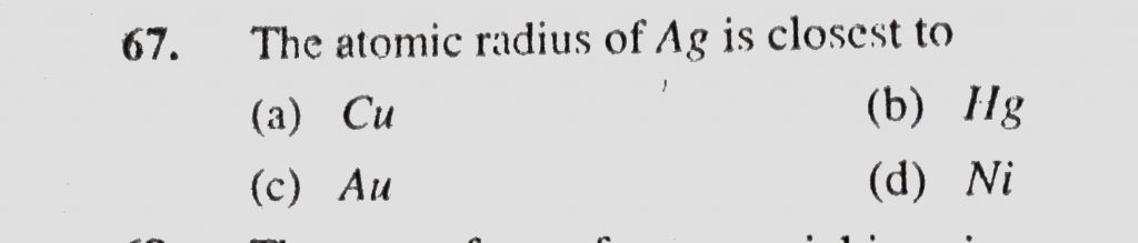 The atomic radius of Ag is closest to (a) Cu (b) Hg (c) Au (d) Ni The atomic radius of Ag is closest to (a) Cu (b) Hg (c) Au (d) Ni December 3, 2020 Category: Uncategorised (JEE Advanced Physics by BM Sharma + GMP Solutions) , Facebook Messenger WhatsApp Share this:TwitterFacebook Related