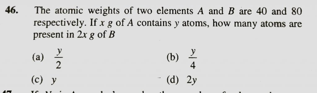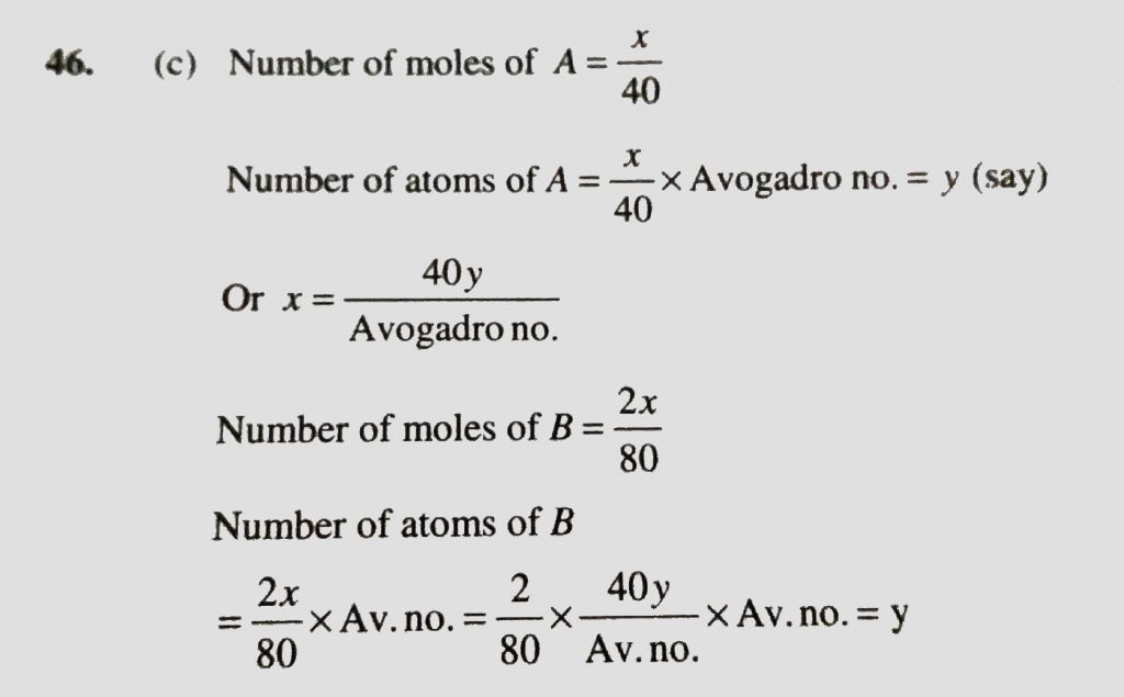 The atomic weights of two elements A and B are 40 and 80 respectively. If x g of A contains y atoms, how many atoms are present in 2 x g of B how many atoms are present in 2 x g of B The atomic weights of two elements A and B are 40 and 80 respectively. If x g of A contains y atoms November 22, 2020 Category: Uncategorised (JEE Advanced Physics by BM Sharma + GMP Solutions) , Facebook Messenger WhatsApp Share this:TwitterFacebook Related
