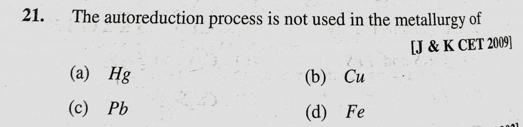 The autoreduction process is not used in the metallurge of (a) Hg (b) Cu (c) Pb (d) Fe The autoreduction process is not used in the metallurge of (a) Hg (b) Cu (c) Pb (d) Fe November 12, 2020 Category: Uncategorised (JEE Advanced Physics by BM Sharma + GMP Solutions) , Facebook Messenger WhatsApp Share this:TwitterFacebook Related