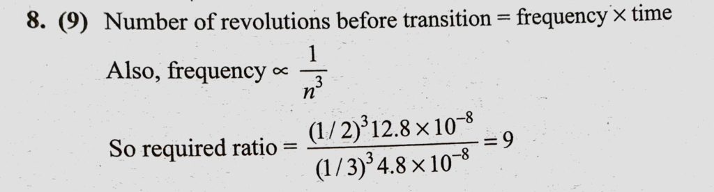 The average lifetime for the n = 3 excited state of a hydrogen-like atom is 4.8 * 10^-8 s and that for the n = 2 state is 12.8 * 10^-8 s. The ratio of the average number of revolutions made The average lifetime for the n = 3 excited state of a hydrogen-like atom is 4.8 * 10^-8 s and that for the n = 2 state is 12.8 * 10^-8 s. The ratio of the average number of revolutions made October 16, 2020 Category: Uncategorised (JEE Advanced Physics by BM Sharma + GMP Solutions) , Facebook Messenger WhatsApp Share this:TwitterFacebook Related