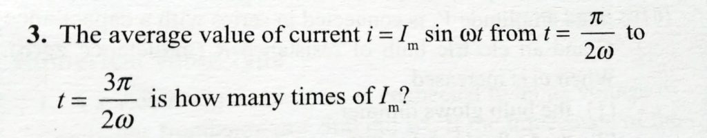 The average value of current i = Im sin omega t from t = pie / 2 omega to t = 3 pie / 2 omega is how many times of Im ? The average value of current i = Im sin omega t from t = pie / 2 omega to t = 3 pie / 2 omega is how many times of Im ? October 28, 2020 Category: Uncategorised (JEE Advanced Physics by BM Sharma + GMP Solutions) , Facebook Messenger WhatsApp Share this:TwitterFacebook Related