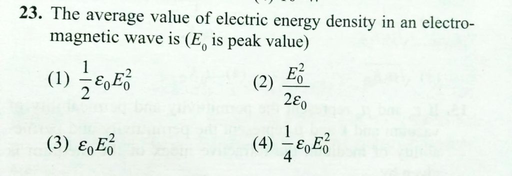 The average value of electric energy density in an electromagnetic wave is ( E 0 is peak value ) The average value of electric energy density in an electromagnetic wave is ( E 0 is peak value ) October 29, 2020 Category: Uncategorised (JEE Advanced Physics by BM Sharma + GMP Solutions) , Facebook Messenger WhatsApp Share this:TwitterFacebook Related
