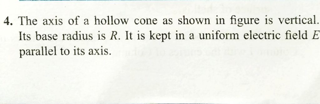 The axis of a hallow cone as shown in figure is vertical. Its base radius is R. It is kept in a uniform electric field E parallel to its axis. The axis of a hallow cone as shown in figure is vertical. Its base radius is R. It is kept in a uniform electric field E parallel to its axis. November 1, 2020 Category: Uncategorised (JEE Advanced Physics by BM Sharma + GMP Solutions) , Facebook Messenger WhatsApp Share this:TwitterFacebook Related