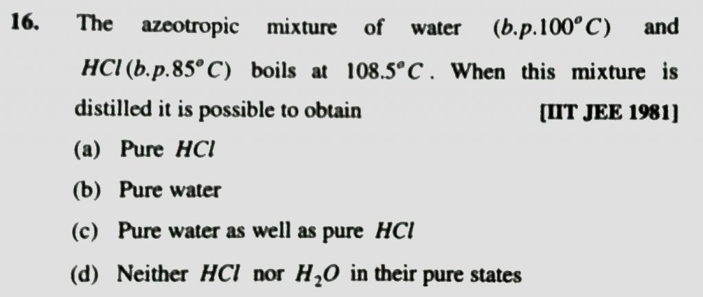 The azeotropic mixture of water (B.P.=100∘C) and HCl(B.P.=86∘C)boils at about 120∘C. During fractional distillation of this mixture it is possible to obtain : The azeotropic mixture of water (B.P.=100∘C) and HCl(B.P.=86∘C)boils at about 120∘C. During fractional distillation of this mixture it is possible to obtain : December 14, 2020 Category: Uncategorised (JEE Advanced Physics by BM Sharma + GMP Solutions) , Facebook Messenger WhatsApp Share this:TwitterFacebook Related