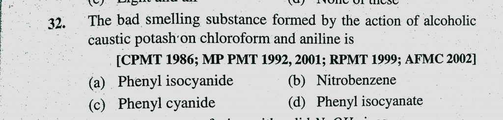 The bad smelling substance formed by the action of alcoholic caustic potash on chloroform and aniline is (a) Phenyl isocyanide (b) Nitrobenzene The bad smelling substance formed by the action of alcoholic caustic potash on chloroform and aniline is (a) Phenyl isocyanide (b) Nitrobenzene February 8, 2021 Category: Uncategorised (JEE Advanced Physics by BM Sharma + GMP Solutions) , Facebook Messenger WhatsApp Share this:TwitterFacebook Related