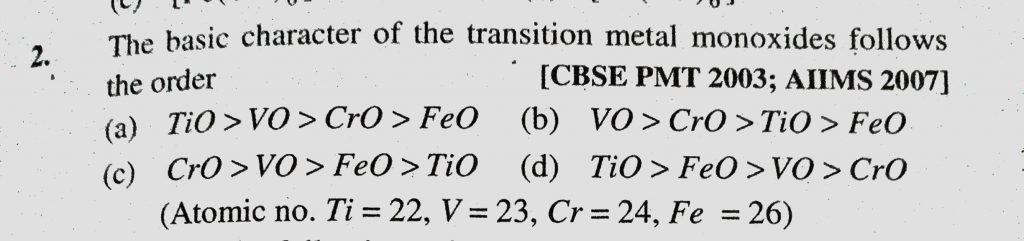 The basic character of the transition metal monoxides follows the order (a) TiO > VO > CrO > FeO The basic character of the transition metal monoxides follows the order (a) TiO > VO > CrO > FeO December 2, 2020 Category: Uncategorised (JEE Advanced Physics by BM Sharma + GMP Solutions) , Facebook Messenger WhatsApp Share this:TwitterFacebook Related