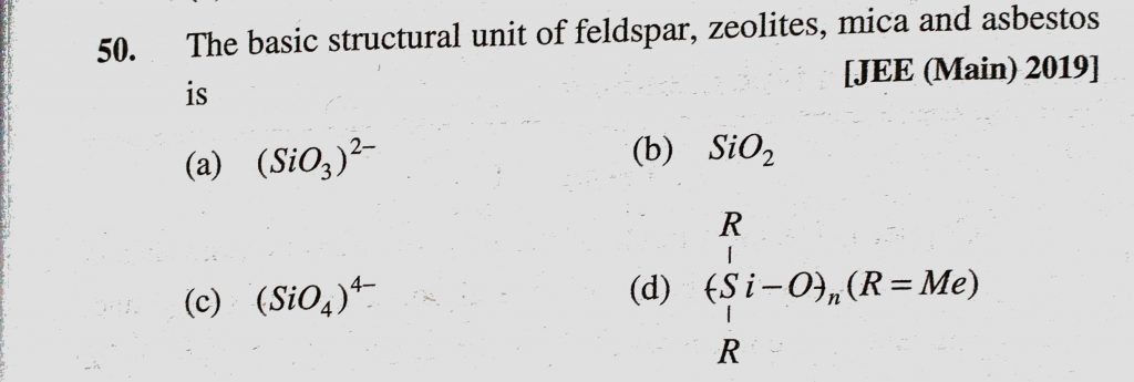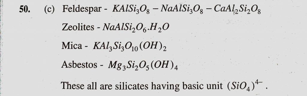 The basic structural unit of feldspar, zeolites, mica and asbestos is (SiO3) 2- mica and asbestos is (SiO3) 2- The basic structural unit of feldspar zeolites November 12, 2020 Category: Uncategorised (JEE Advanced Physics by BM Sharma + GMP Solutions) , Facebook Messenger WhatsApp Share this:TwitterFacebook Related