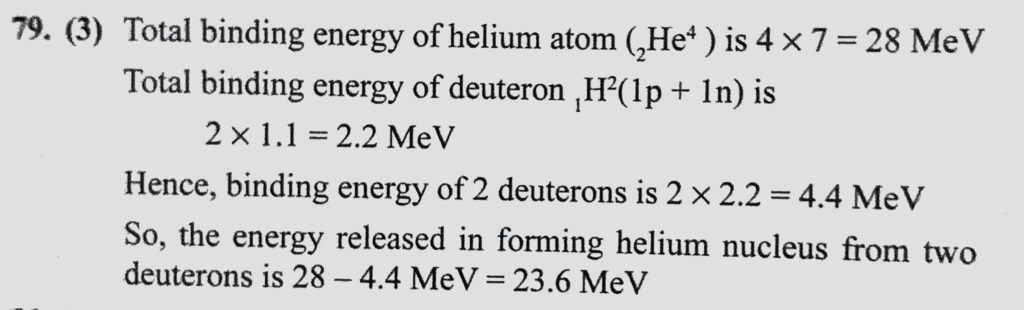 The binding energies per nucleon of deuteron (1H2) and helium (2He4) atoms are 1.1 MeV and 7 MeV. If two deuteron atoms react to form a single helium atom, then the energy released The binding energies per nucleon of deuteron (1H2) and helium (2He4) atoms are 1.1 MeV and 7 MeV. If two deuteron atoms react to form a single helium atom then the energy released October 18, 2020 Category: Uncategorised (JEE Advanced Physics by BM Sharma + GMP Solutions) , Facebook Messenger WhatsApp Share this:TwitterFacebook Related