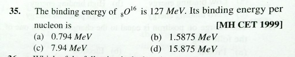 The binding energy of 8O^16 is 127 MeV. Its binding energy per nucleon is The binding energy of 8O^16 is 127 MeV. Its binding energy per nucleon is February 13, 2021 Category: Uncategorised (JEE Advanced Physics by BM Sharma + GMP Solutions) , Facebook Messenger WhatsApp Share this:TwitterFacebook Related