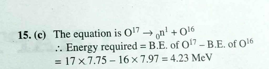 The binding energy per nucleon of O16 is 7.97 Me V and that of O17 is 7.75 Me v. The energy (in Me v ) required to remove a neutron from O17 is The binding energy per nucleon of O16 is 7.97 Me V and that of O17 is 7.75 Me v. The energy (in Me v ) required to remove a neutron from O17 is September 14, 2020 Category: Uncategorised (JEE Advanced Physics by BM Sharma + GMP Solutions) , Facebook Messenger WhatsApp Share this:TwitterFacebook Related