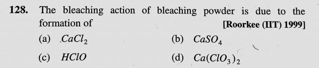 The bleaching action of bleaching powder is due to the formation of (a) CaCl2 (b) CaSO4 (c) HClO (d) Ca(ClO3)2 The bleaching action of bleaching powder is due to the formation of (a) CaCl2 (b) CaSO4 (c) HClO (d) Ca(ClO3)2 November 27, 2020 Category: Uncategorised (JEE Advanced Physics by BM Sharma + GMP Solutions) , Facebook Messenger WhatsApp Share this:TwitterFacebook Related