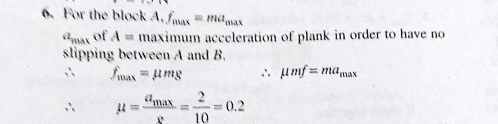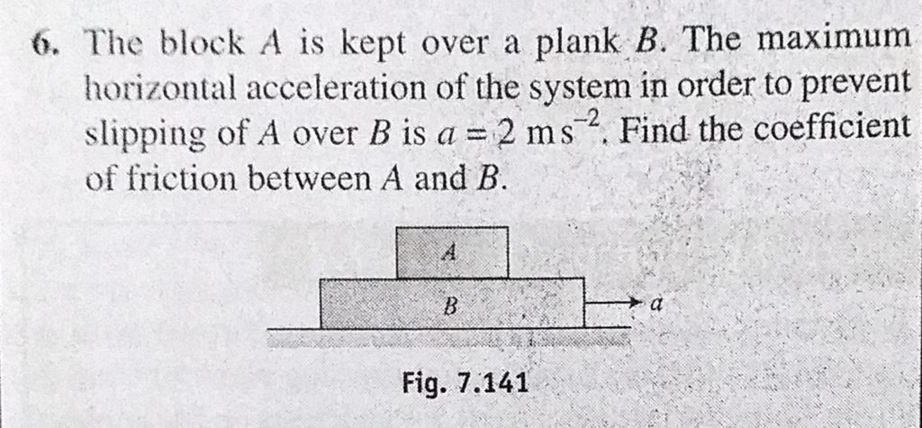The block A is kept over a plank B. The maximum horizontal acceleration of the system in order to prevent slipping of A over B is a = 2 m/s^2. Find the coefficient of friction between A and B. The block A is kept over a plank B. The maximum horizontal acceleration of the system in order to prevent slipping of A over B is a = 2 m/s^2. Find the coefficient of friction between A and B. September 30, 2020 Category: Uncategorised (JEE Advanced Physics by BM Sharma + GMP Solutions) , Facebook Messenger WhatsApp Share this:TwitterFacebook Related