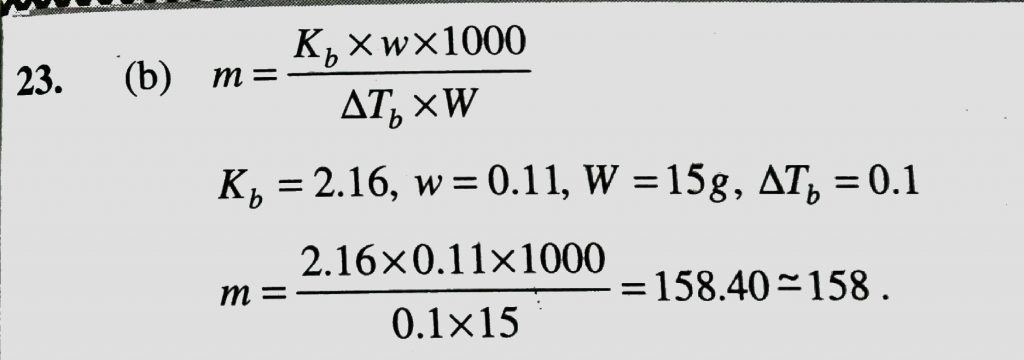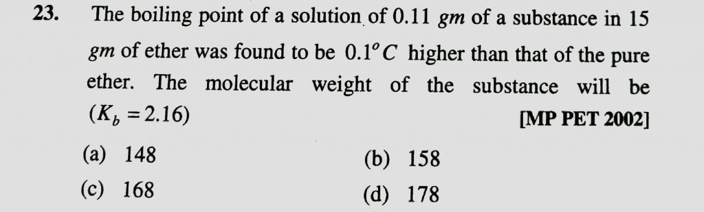 The boiling point of a solution of 0.11g of a substance is 15g of ether was found to be 0.1∘C higher than that of pure ether. The molecular weight of the substance will be (Kb=2.16) The boiling point of a solution of 0.11g of a substance is 15g of ether was found to be 0.1∘C higher than that of pure ether. The molecular weight of the substance will be (Kb=2.16) December 13, 2020 Category: Uncategorised (JEE Advanced Physics by BM Sharma + GMP Solutions) , Facebook Messenger WhatsApp Share this:TwitterFacebook Related