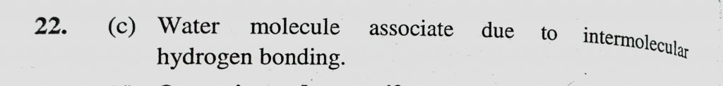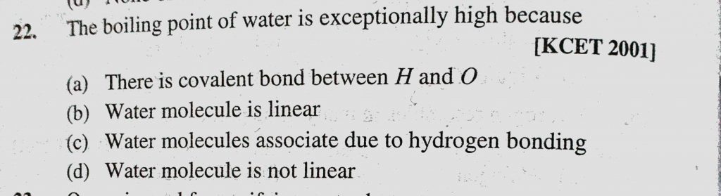 The boiling point of water is exceptinally high because (a) There is covalent bond between H and O (b) Water molecule is linear (c) Water molecules associate due to hydrogen bonding The boiling point of water is exceptinally high because (a) There is covalent bond between H and O (b) Water molecule is linear (c) Water molecules associate due to hydrogen bonding November 13, 2020 Category: Uncategorised (JEE Advanced Physics by BM Sharma + GMP Solutions) , Facebook Messenger WhatsApp Share this:TwitterFacebook Related