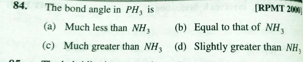 The bond angle in PH3 is (a) MUch less than NH3 (b) Equal to that of NH3 (c) Much greater than NH3 (d) slightly greater than NH3 The bond angle in PH3 is (a) MUch less than NH3 (b) Equal to that of NH3 (c) Much greater than NH3 (d) slightly greater than NH3 December 6, 2020 Category: Uncategorised (JEE Advanced Physics by BM Sharma + GMP Solutions) , Facebook Messenger WhatsApp Share this:TwitterFacebook Related