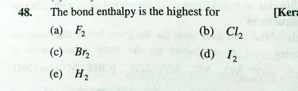 THe bond ethalpy is the highest for (a) F2 (b) CL2 (c) Br2 (d) I2 (e) H2 THe bond ethalpy is the highest for (a) F2 (b) CL2 (c) Br2 (d) I2 (e) H2 December 6, 2020 Category: Uncategorised (JEE Advanced Physics by BM Sharma + GMP Solutions) , Facebook Messenger WhatsApp Share this:TwitterFacebook Related