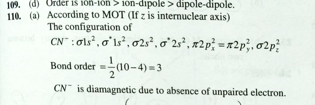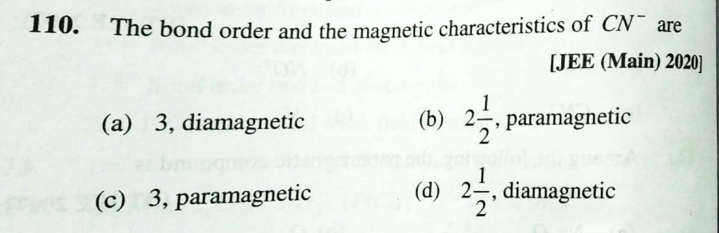 The bond orde3r and the magnetic characteristics ofd CN^- are (a) 3 , diamagnetic (b) 2.5 , paramagnetic (c) 3 , paramagnetic (d) 2.5 , diamagnetic diamagnetic diamagnetic (b) 2.5 paramagnetic (c) 3 paramagnetic (d) 2.5 The bond orde3r and the magnetic characteristics ofd CN^- are (a) 3 December 10, 2020 Category: Uncategorised (JEE Advanced Physics by BM Sharma + GMP Solutions) , Facebook Messenger WhatsApp Share this:TwitterFacebook Related