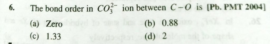 The bond order in CO3^2- ion between C – O is (a) zero (b) 0.88 (c) 1.33 (d) 2 The bond order in CO3^2- ion between C - O is (a) zero (b) 0.88 (c) 1.33 (d) 2 December 7, 2020 Category: Uncategorised (JEE Advanced Physics by BM Sharma + GMP Solutions) , Facebook Messenger WhatsApp Share this:TwitterFacebook Related