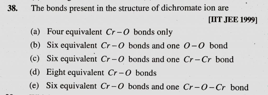 The bonds present in the structure of dichromate ion are (a) Four equivalent Cr-O bonds only The bonds present in the structure of dichromate ion are (a) Four equivalent Cr-O bonds only December 2, 2020 Category: Uncategorised (JEE Advanced Physics by BM Sharma + GMP Solutions) , Facebook Messenger WhatsApp Share this:TwitterFacebook Related
