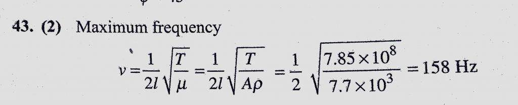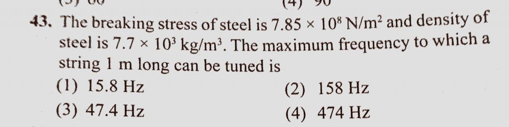 The breaking stress of steel is 7.85 * 10^8 N/m^2 and density of steel is 7.7 * 10^3 kg/m^3. The maximum frequency to which a string 1 m long can be tuned is The breaking stress of steel is 7.85 * 10^8 N/m^2 and density of steel is 7.7 * 10^3 kg/m^3. The maximum frequency to which a string 1 m long can be tuned is November 6, 2020 Category: Uncategorised (JEE Advanced Physics by BM Sharma + GMP Solutions) , Facebook Messenger WhatsApp Share this:TwitterFacebook Related