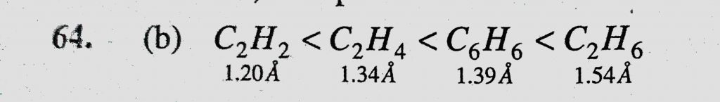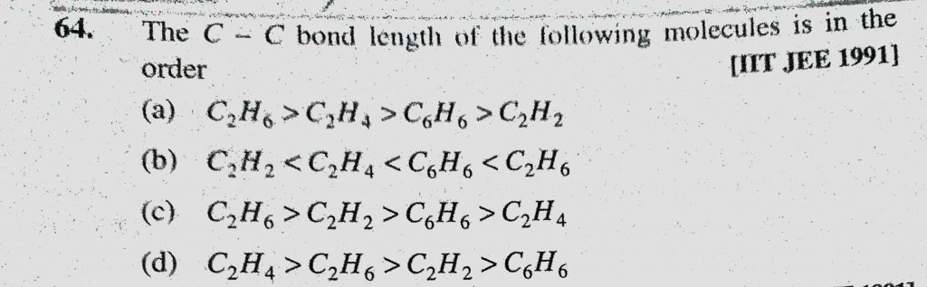The C-C bond length of the following molecules is in the order (a) C2H6 > C2H4 > C6H6 > C2H2 The C-C bond length of the following molecules is in the order (a) C2H6 > C2H4 > C6H6 > C2H2 December 11, 2020 Category: Uncategorised (JEE Advanced Physics by BM Sharma + GMP Solutions) , Facebook Messenger WhatsApp Share this:TwitterFacebook Related