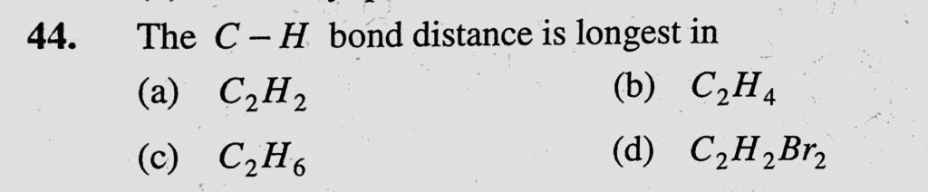 The C – H bond distance is longest in (a) C2H2 (b) C2H4 (c) C2H6 (d) C2H2Br2 The C - H bond distance is longest in (a) C2H2 (b) C2H4 (c) C2H6 (d) C2H2Br2 December 16, 2020 Category: Uncategorised (JEE Advanced Physics by BM Sharma + GMP Solutions) , Facebook Messenger WhatsApp Share this:TwitterFacebook Related