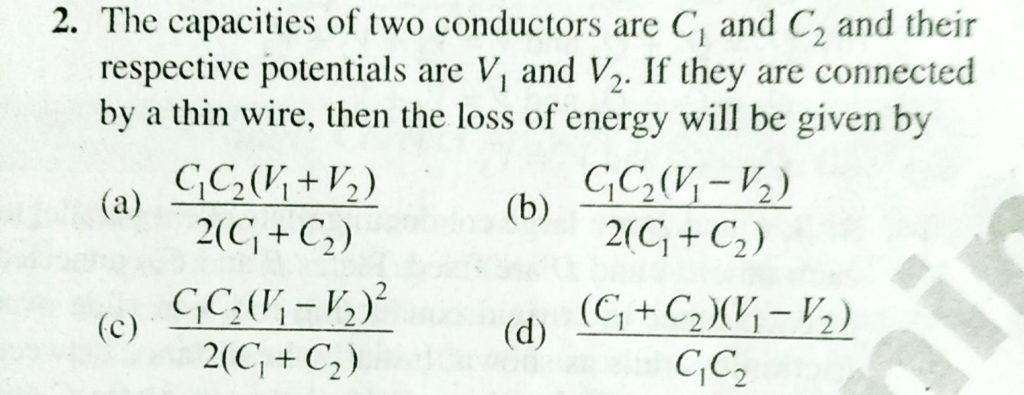 The capacities of two conductors are C1 and C2 and their respective potentials are V1 and V2 . If they are connected by a thin wire, then the loss of energy will be given by The capacities of two conductors are C1 and C2 and their respective potentials are V1 and V2 . If they are connected by a thin wire then the loss of energy will be given by September 18, 2020 Category: Uncategorised (JEE Advanced Physics by BM Sharma + GMP Solutions) , Facebook Messenger WhatsApp Share this:TwitterFacebook Related