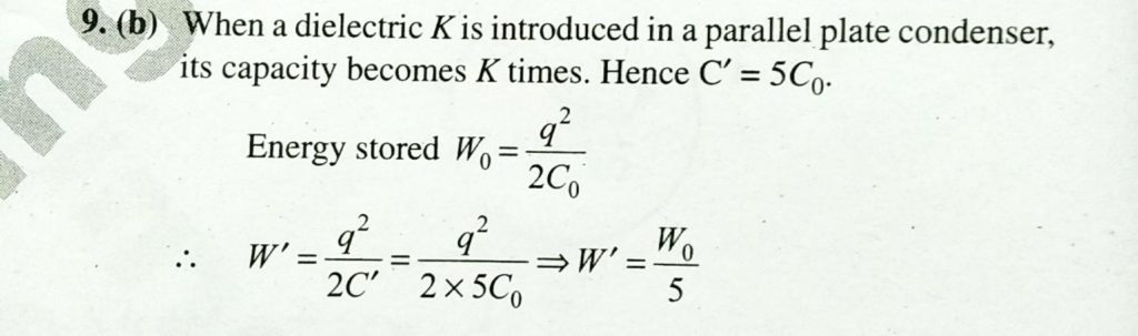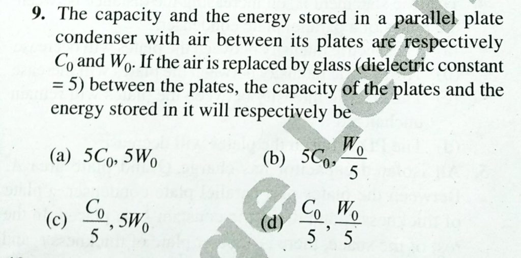 The capacity and the energy stored in a parallel plate condenser with air between its plates are respectively C0 and W0. If the air is replaced by glass (dielectric constant =5) between the plates, the capacity of the plates and the energy stored in it will respectively be