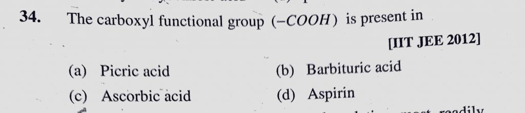 The carboxyl functional group (-COOH ) is present in (a) Picric acid (b) Barbituric acid (c) Ascorbic acid (d) Aspirin The carboxyl functional group (-COOH ) is present in (a) Picric acid (b) Barbituric acid (c) Ascorbic acid (d) Aspirin February 13, 2021 Category: Uncategorised (JEE Advanced Physics by BM Sharma + GMP Solutions) , Facebook Messenger WhatsApp Share this:TwitterFacebook Related