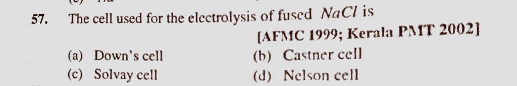 The cell used for the electrolysis of fused NaCl is (a) Down’s cell (b) Castner cell (c) Solvay cell (d) Nelson cell The cell used for the electrolysis of fused NaCl is (a) Down's cell (b) Castner cell (c) Solvay cell (d) Nelson cell November 13, 2020 Category: Uncategorised (JEE Advanced Physics by BM Sharma + GMP Solutions) , Facebook Messenger WhatsApp Share this:TwitterFacebook Related