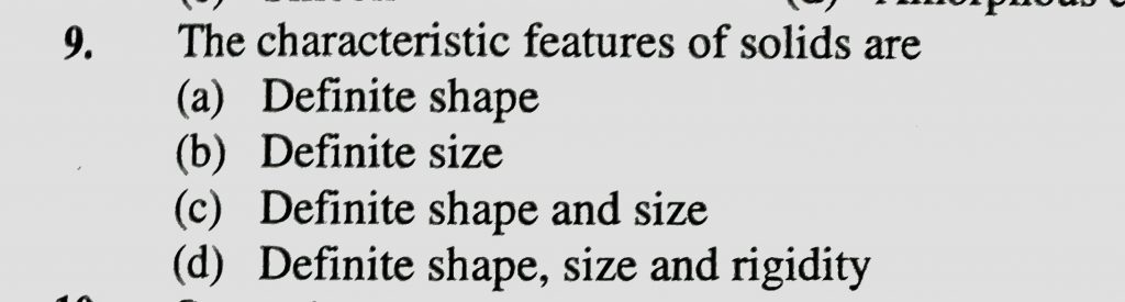 The characteristic features of solids are (a) Define shape (b) Definite size (c) Definite shape and size (d) definite shape , size and rigidity size and rigidity The characteristic features of solids are (a) Define shape (b) Definite size (c) Definite shape and size (d) definite shape February 8, 2021 Category: Uncategorised (JEE Advanced Physics by BM Sharma + GMP Solutions) , Facebook Messenger WhatsApp Share this:TwitterFacebook Related