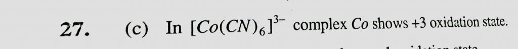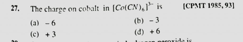 The charge on cobalt in [Co(CN)6 ]^3- is (a) -6 (b) -3 (c) +3 (d) +6 The charge on cobalt in [Co(CN)6 ]^3- is (a) -6 (b) -3 (c) +3 (d) +6 November 23, 2020 Category: Uncategorised (JEE Advanced Physics by BM Sharma + GMP Solutions) , Facebook Messenger WhatsApp Share this:TwitterFacebook Related