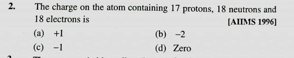 The charge on the atom containing 17 protons , 18 neutrons and 18 electrons is (a) +1 (b) -2 (c) -1 (d) zero 18 neutrons and 18 electrons is (a) +1 (b) -2 (c) -1 (d) zero The charge on the atom containing 17 protons November 26, 2020 Category: Uncategorised (JEE Advanced Physics by BM Sharma + GMP Solutions) , Facebook Messenger WhatsApp Share this:TwitterFacebook Related