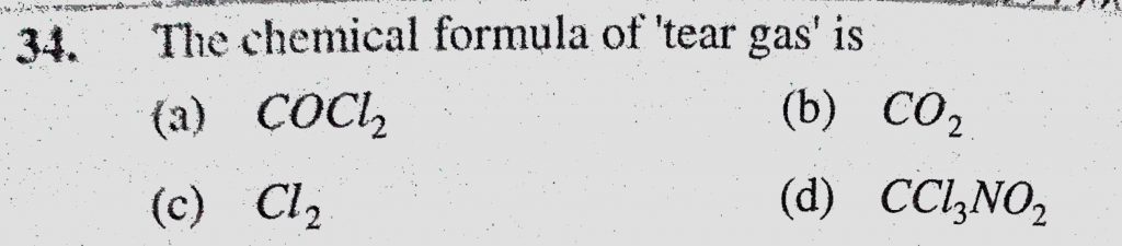 The chemical formula of ‘tear gas’ is (a) COCl2 (b) CO2 (c) Cl2 (d) CCl3NO2 The chemical formula of 'tear gas' is (a) COCl2 (b) CO2 (c) Cl2 (d) CCl3NO2 November 18, 2020 Category: Uncategorised (JEE Advanced Physics by BM Sharma + GMP Solutions) , Facebook Messenger WhatsApp Share this:TwitterFacebook Related