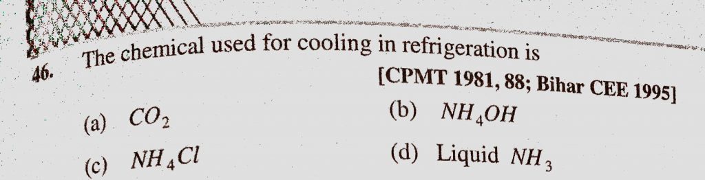 The chemical used for cooling in refrigeration is (a) CO2 (b) NH4OH (c) NH4Cl (d) Liquid NH3 The chemical used for cooling in refrigeration is (a) CO2 (b) NH4OH (c) NH4Cl (d) Liquid NH3 November 18, 2020 Category: Uncategorised (JEE Advanced Physics by BM Sharma + GMP Solutions) , Facebook Messenger WhatsApp Share this:TwitterFacebook Related