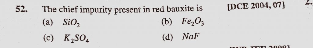 The chief impurity present in red bauxite is (a) SiO2 (b) Fe2O3 (c) K2SO4 (d) NaF The chief impurity present in red bauxite is (a) SiO2 (b) Fe2O3 (c) K2SO4 (d) NaF November 11, 2020 Category: Uncategorised (JEE Advanced Physics by BM Sharma + GMP Solutions) , Facebook Messenger WhatsApp Share this:TwitterFacebook Related