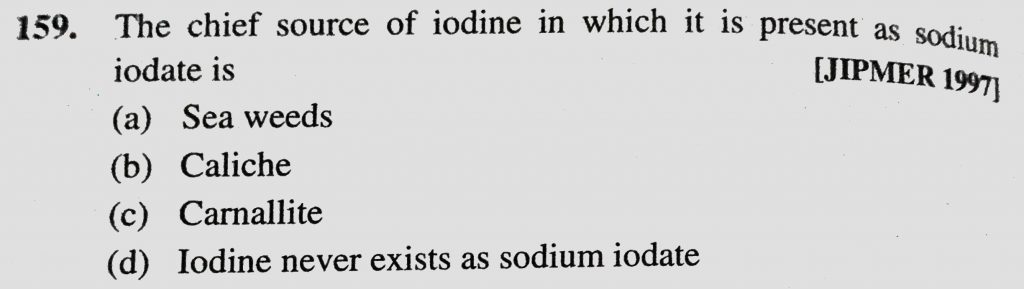 The chief source of iodine in which it is present as sodium iodate is (a) Sea weeds (b) Caliche (c) Carnallite The chief source of iodine in which it is present as sodium iodate is (a) Sea weeds (b) Caliche (c) Carnallite November 25, 2020 Category: Uncategorised (JEE Advanced Physics by BM Sharma + GMP Solutions) , Facebook Messenger WhatsApp Share this:TwitterFacebook Related