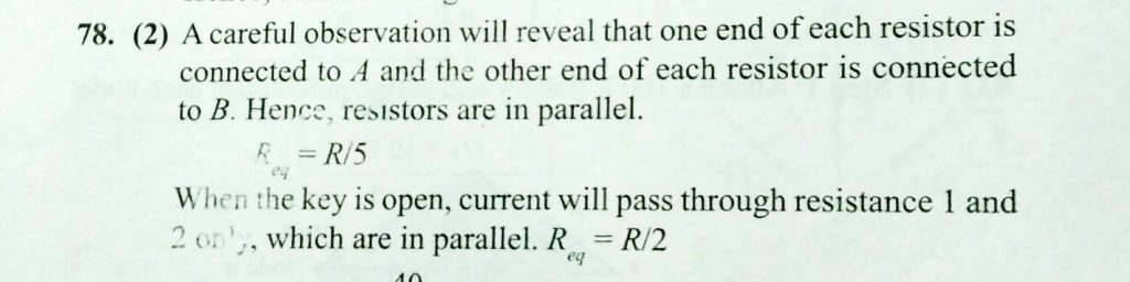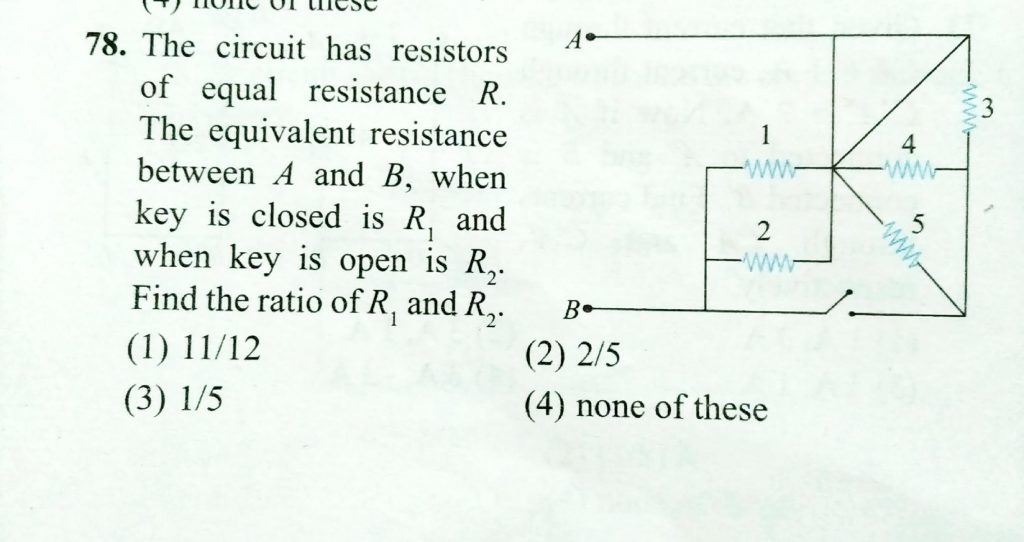 The circuit has resistoors of equal resistance R . The equivalent resistance between A and B , when key is closed is R1 and when key is open is R2. Find the ratio of R1 and R2. The circuit has resistoors of equal resistance R . The equivalent resistance between A and B when key is closed is R1 and when key is open is R2. Find the ratio of R1 and R2. November 12, 2020 Category: Uncategorised (JEE Advanced Physics by BM Sharma + GMP Solutions) , Facebook Messenger WhatsApp Share this:TwitterFacebook Related