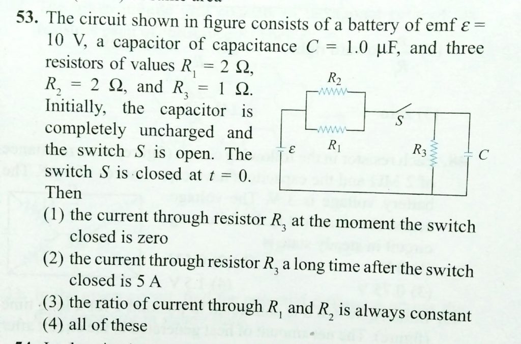 The circuit shown in the figure consists of a battery of emf ε=10V , a capacitor of capacitance C=1.0μF and three resistors of value R1=2Ω,R2=2Ω and R3=1Ω, Initially the capacitor is completely uncharged and the switch S is open. The switch S is closed at t=0. Then