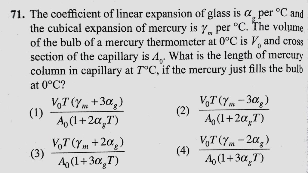 The coefficient of linear expansion of glass is alpha g per C and the cubical expansion of mercury is lemda m per C. The volume of the bulb of a mercury thermometer at 0 C is V0 and cross section The coefficient of linear expansion of glass is alpha g per C and the cubical expansion of mercury is lemda m per C. The volume of the bulb of a mercury thermometer at 0 C is V0 and cross section October 24, 2020 Category: Uncategorised (JEE Advanced Physics by BM Sharma + GMP Solutions) , Facebook Messenger WhatsApp Share this:TwitterFacebook Related