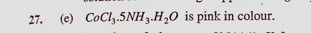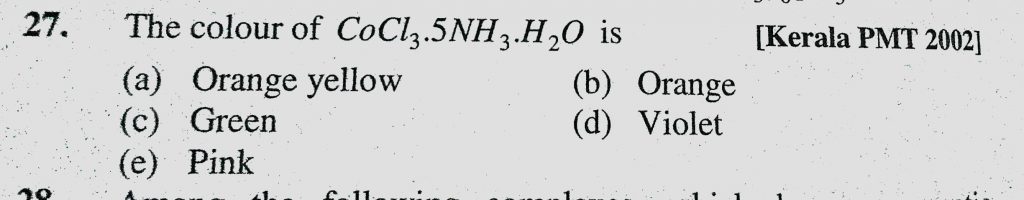 The colour of CoCl3.5NH3.H20 is (a) Orange yellow (b) Orange (c) Green (d) Violet (e) Pink The colour of CoCl3.5NH3.H20 is (a) Orange yellow (b) Orange (c) Green (d) Violet (e) Pink December 4, 2020 Category: Uncategorised (JEE Advanced Physics by BM Sharma + GMP Solutions) , Facebook Messenger WhatsApp Share this:TwitterFacebook Related