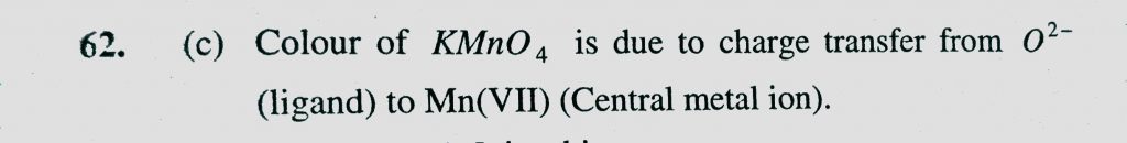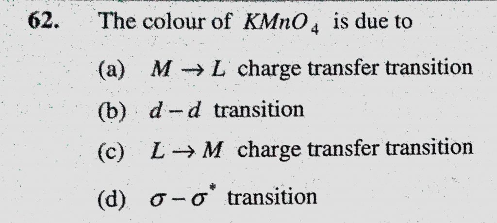 The colour of KMnO4 is due to (a) M to L charge transfer transition (b) d-d transition The colour of KMnO4 is due to (a) M to L charge transfer transition (b) d-d transition December 5, 2020 Category: Uncategorised (JEE Advanced Physics by BM Sharma + GMP Solutions) , Facebook Messenger WhatsApp Share this:TwitterFacebook Related