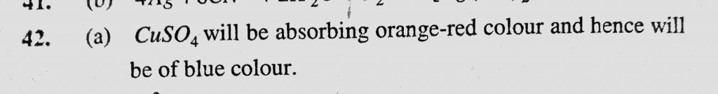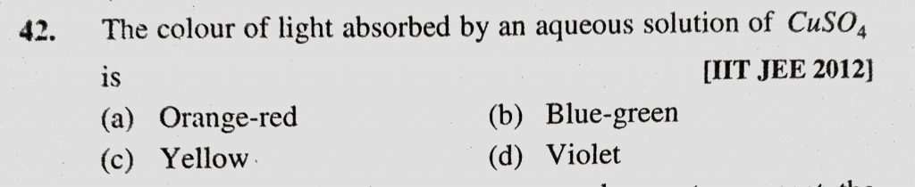 The colour of light absorbed by an aqueous solution of CuSO4 is (a) Orange-red (b) Blue-green (c) Yellow (d) Violet The colour of light absorbed by an aqueous solution of CuSO4 is (a) Orange-red (b) Blue-green (c) Yellow (d) Violet December 2, 2020 Category: Uncategorised (JEE Advanced Physics by BM Sharma + GMP Solutions) , Facebook Messenger WhatsApp Share this:TwitterFacebook Related