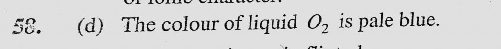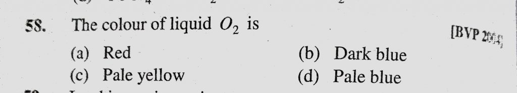 The colour of liquid O2 is (a) Red (b) Dark blue (c) Pale yellow (d) Pale blue The colour of liquid O2 is (a) Red (b) Dark blue (c) Pale yellow (d) Pale blue November 27, 2020 Category: Uncategorised (JEE Advanced Physics by BM Sharma + GMP Solutions) , Facebook Messenger WhatsApp Share this:TwitterFacebook Related