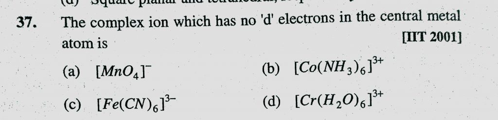 The complex ion which has no ‘d’ electrons in the central metal atom is (a) (MnO4)- (b) (Co(NH3)6) 3+ The complex ion which has no 'd' electrons in the central metal atom is (a) (MnO4)- (b) (Co(NH3)6) 3+ December 5, 2020 Category: Uncategorised (JEE Advanced Physics by BM Sharma + GMP Solutions) , Facebook Messenger WhatsApp Share this:TwitterFacebook Related