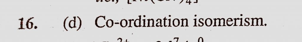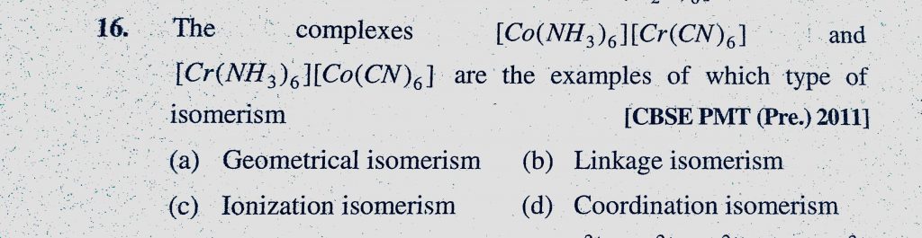 The complexes (Co(NH3)6)(Cr(CN)6) and (Cr(NH3)6)(Co(CN)6) are the examples of which type of isomerism (a) Geometrical isomerism (b) Linkage isomerism The complexes (Co(NH3)6)(Cr(CN)6) and (Cr(NH3)6)(Co(CN)6) are the examples of which type of isomerism (a) Geometrical isomerism (b) Linkage isomerism December 4, 2020 Category: Uncategorised (JEE Advanced Physics by BM Sharma + GMP Solutions) , Facebook Messenger WhatsApp Share this:TwitterFacebook Related